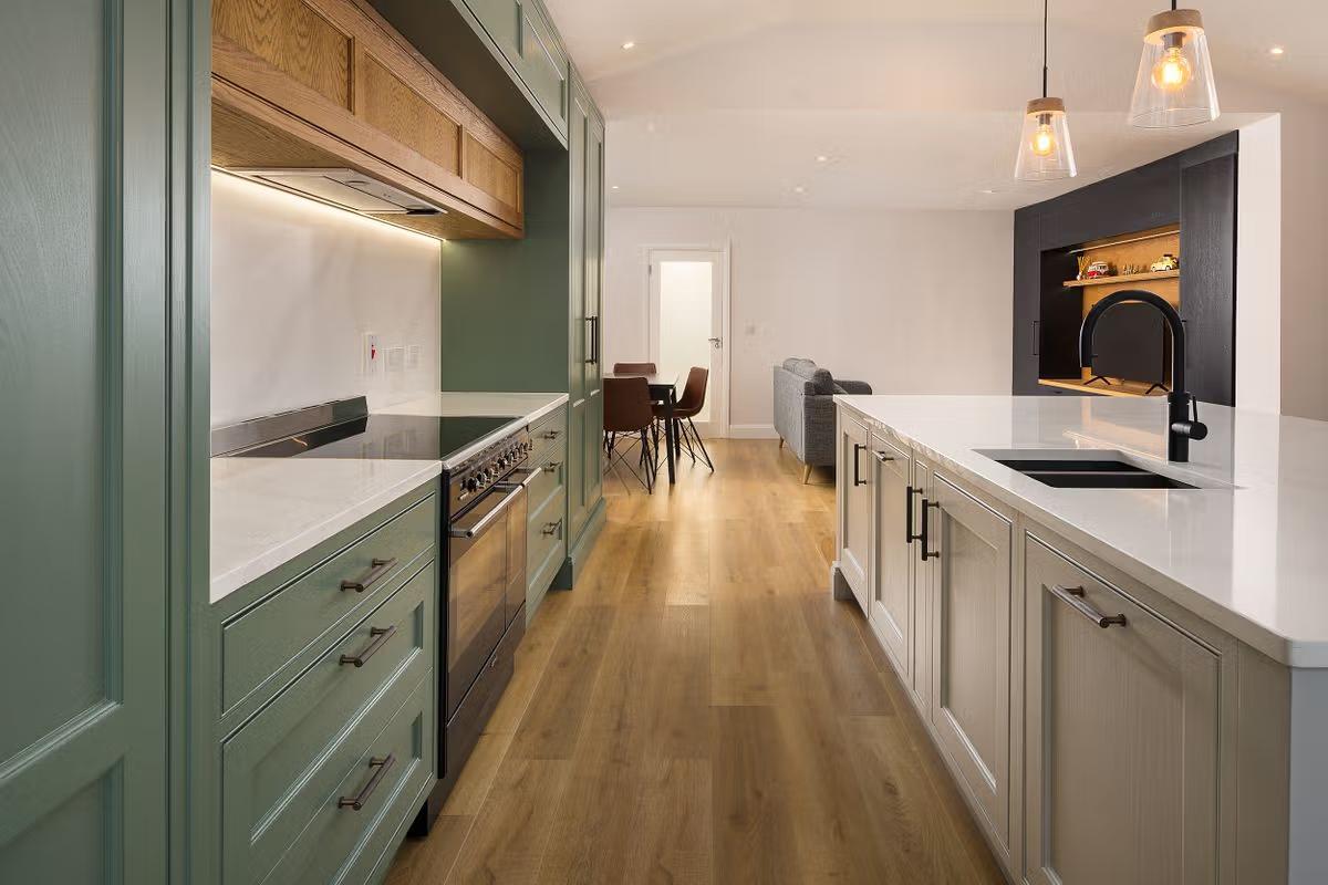 Another completely bespoke kitchen from our heritage range . We absolutely love this project and the colours used . Notice the first tier wall cabinets using a push to open lift mechanism which have been stained to match the flooring !