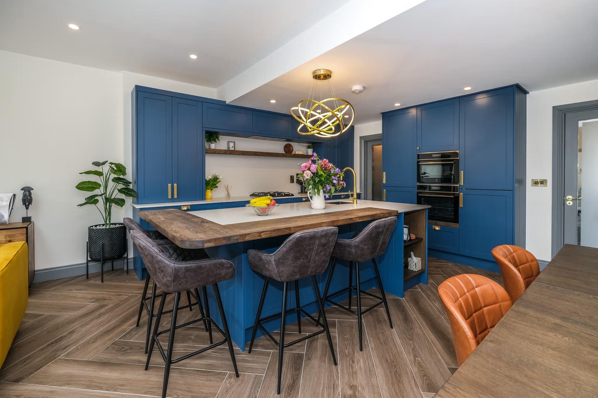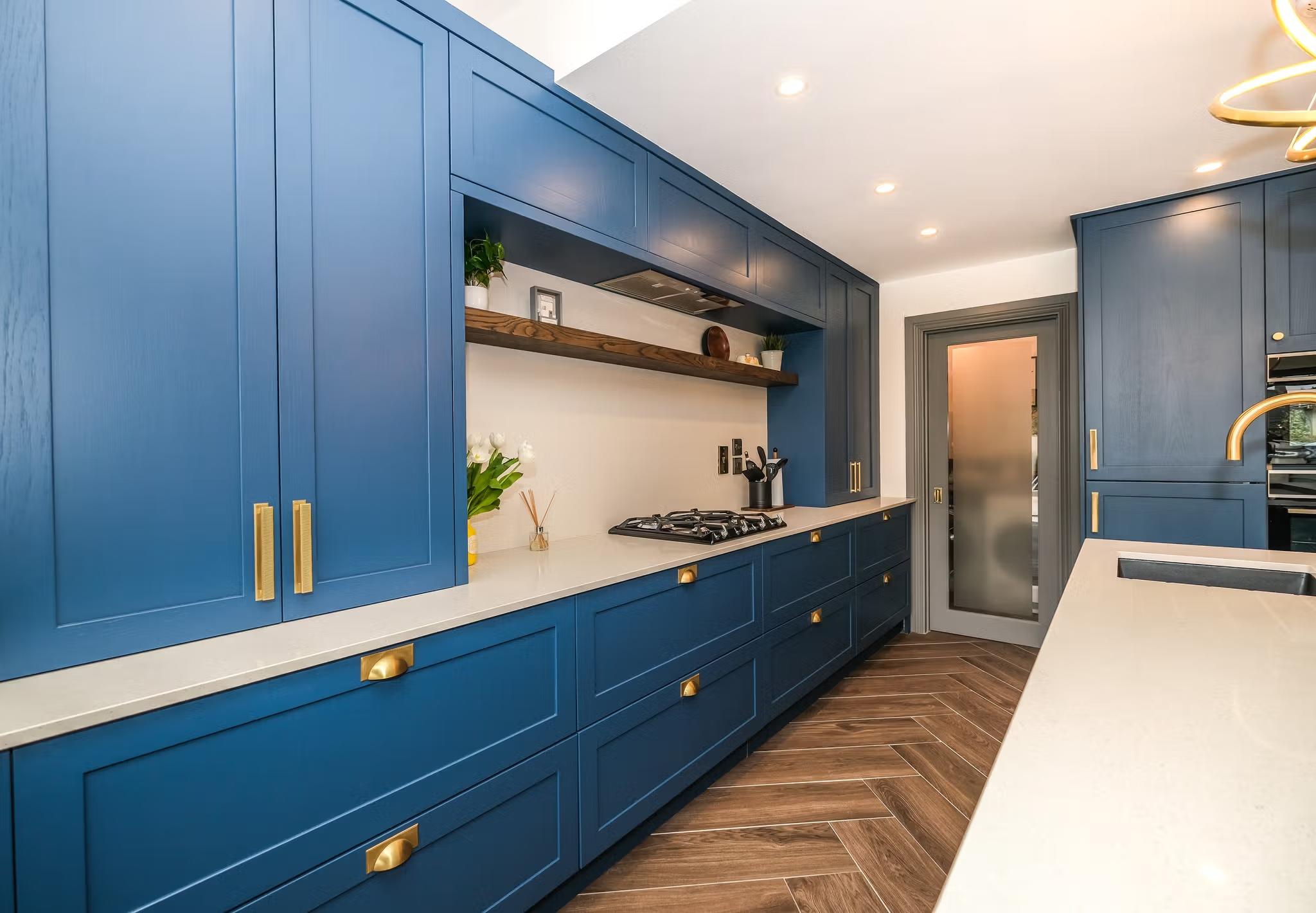 A recent project . The blue and brass ! 😍The stone and timber ! We’ve used bifolding doors along with a simple design to complement the bold colours in this stunning kitchen.