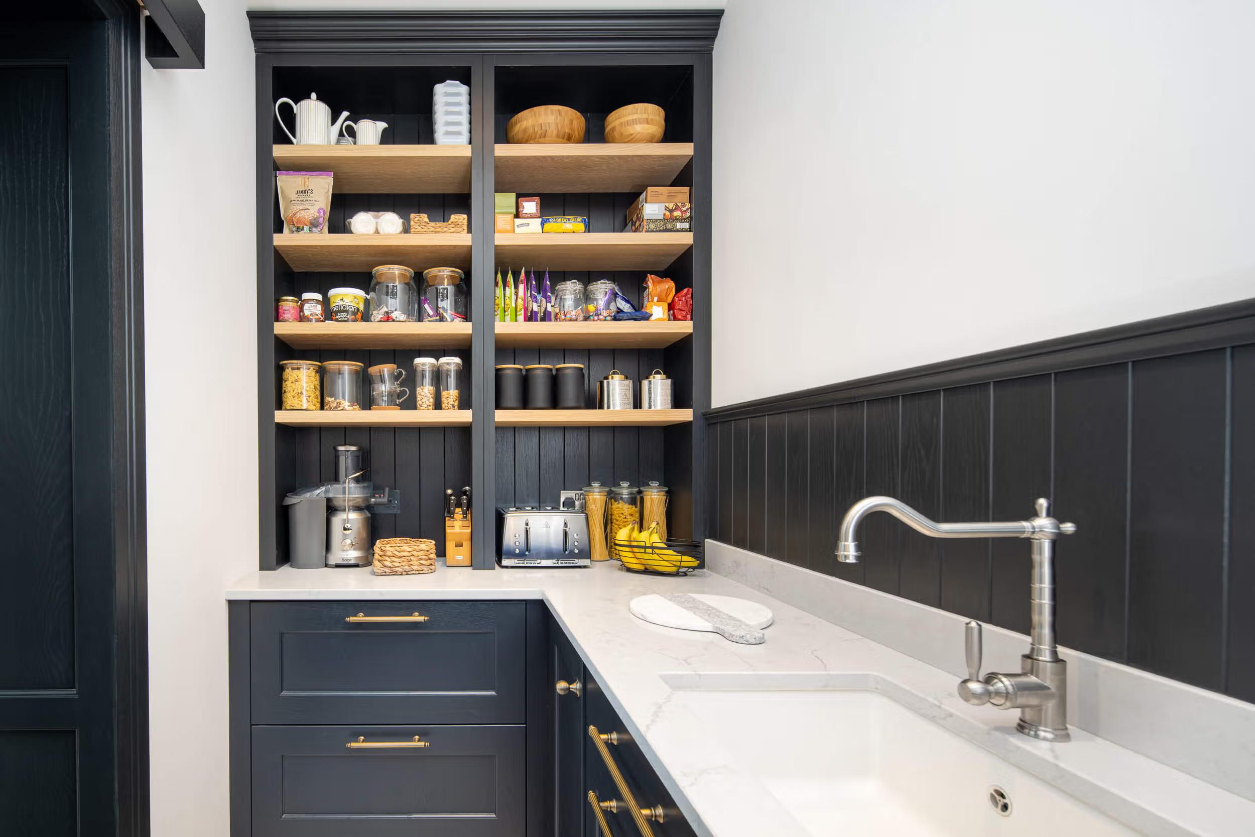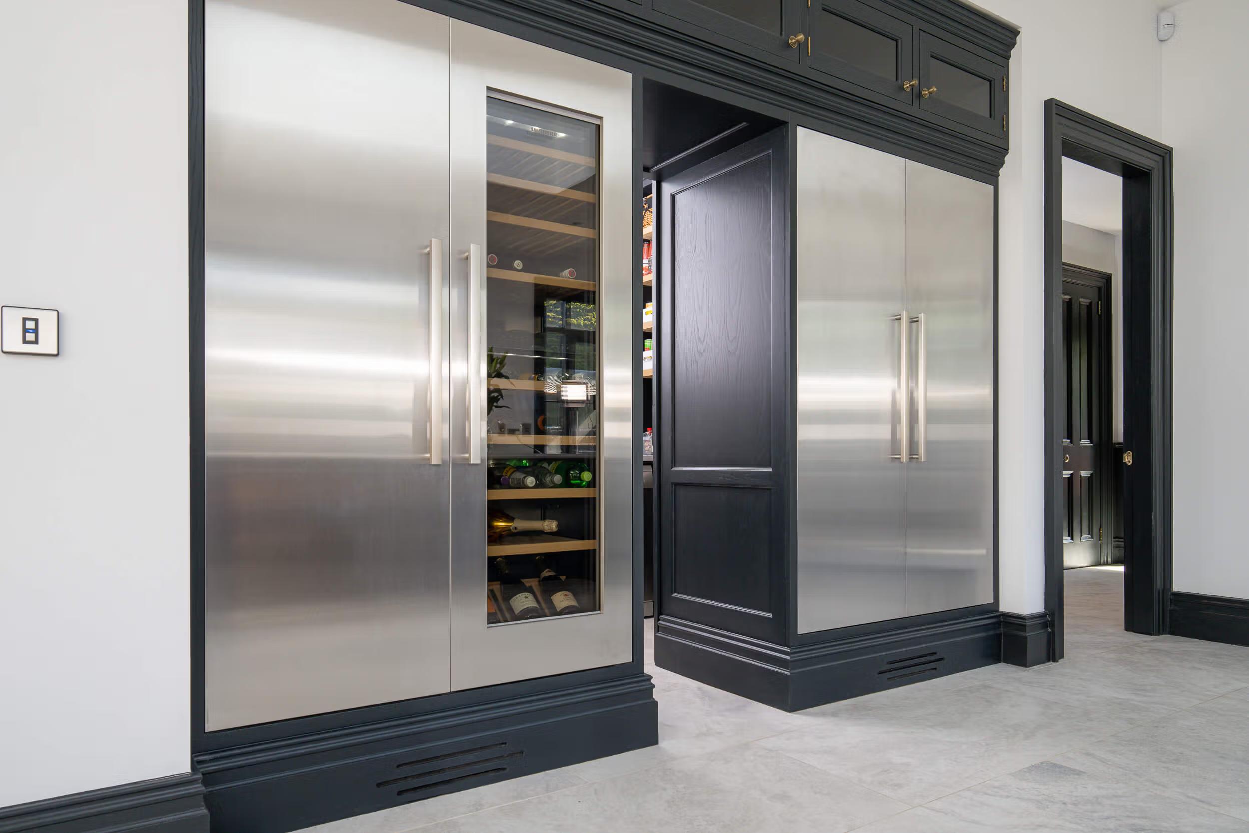 Another handcrafted in-frame kitchen. Our skilled team have worked along side our fabulous clients to create stunning kitchen in their new home. From the 2 meter wide bespoke curved canopy to the handmade cornicing above the incredible fridges and freezer. With an adjoining walk-in pantry through the concealed sliding door and adjacent boot-room.