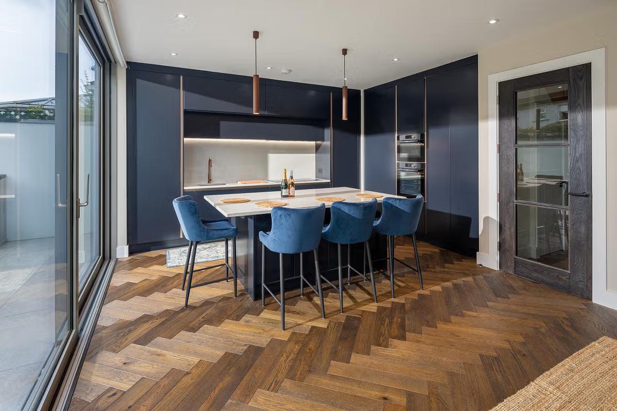We think the photos speak for themselves. From the Contempory kitchen design to the solid oak feature wall in the tv room. Our talented team have designed and executed another amazing one off.