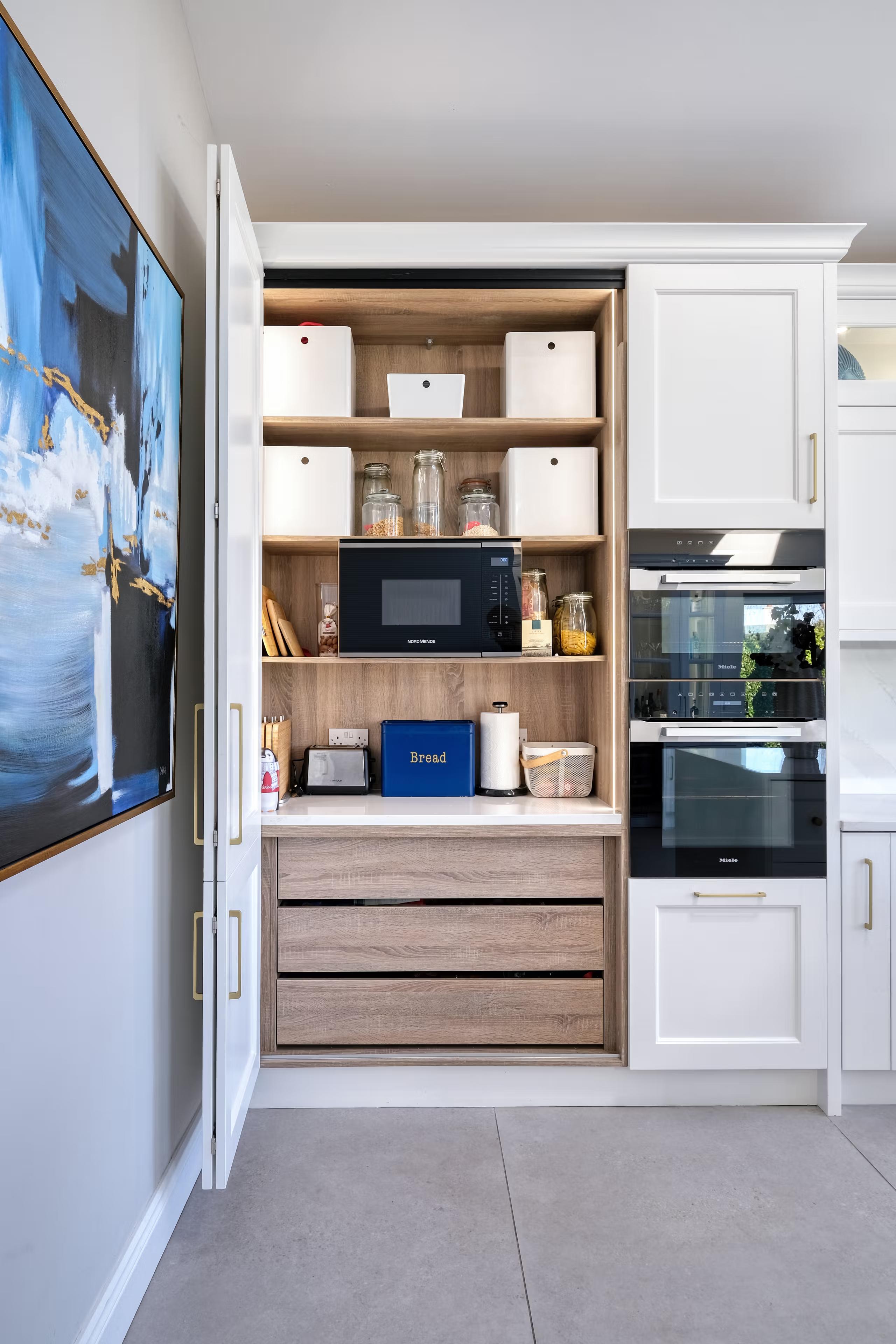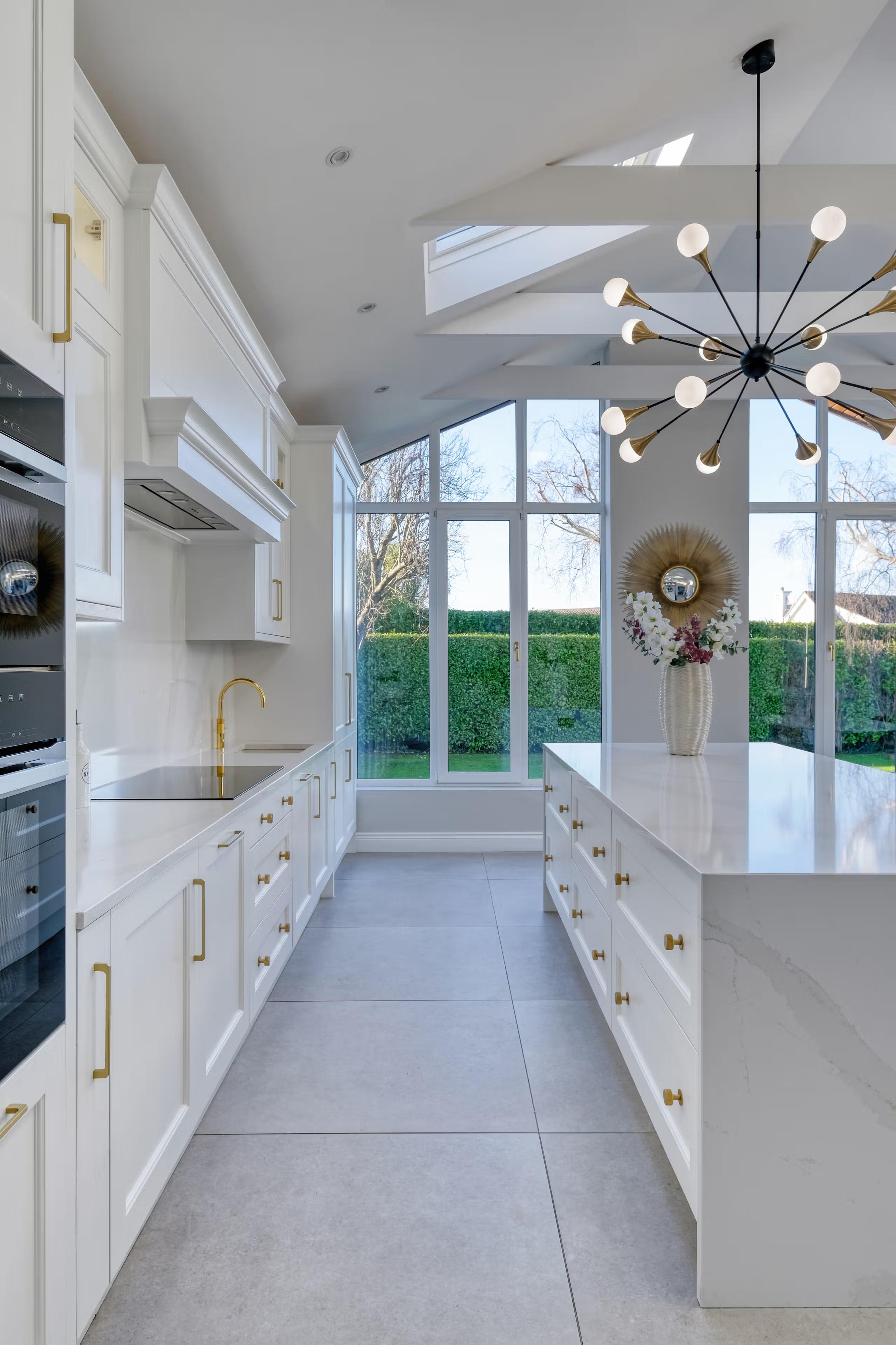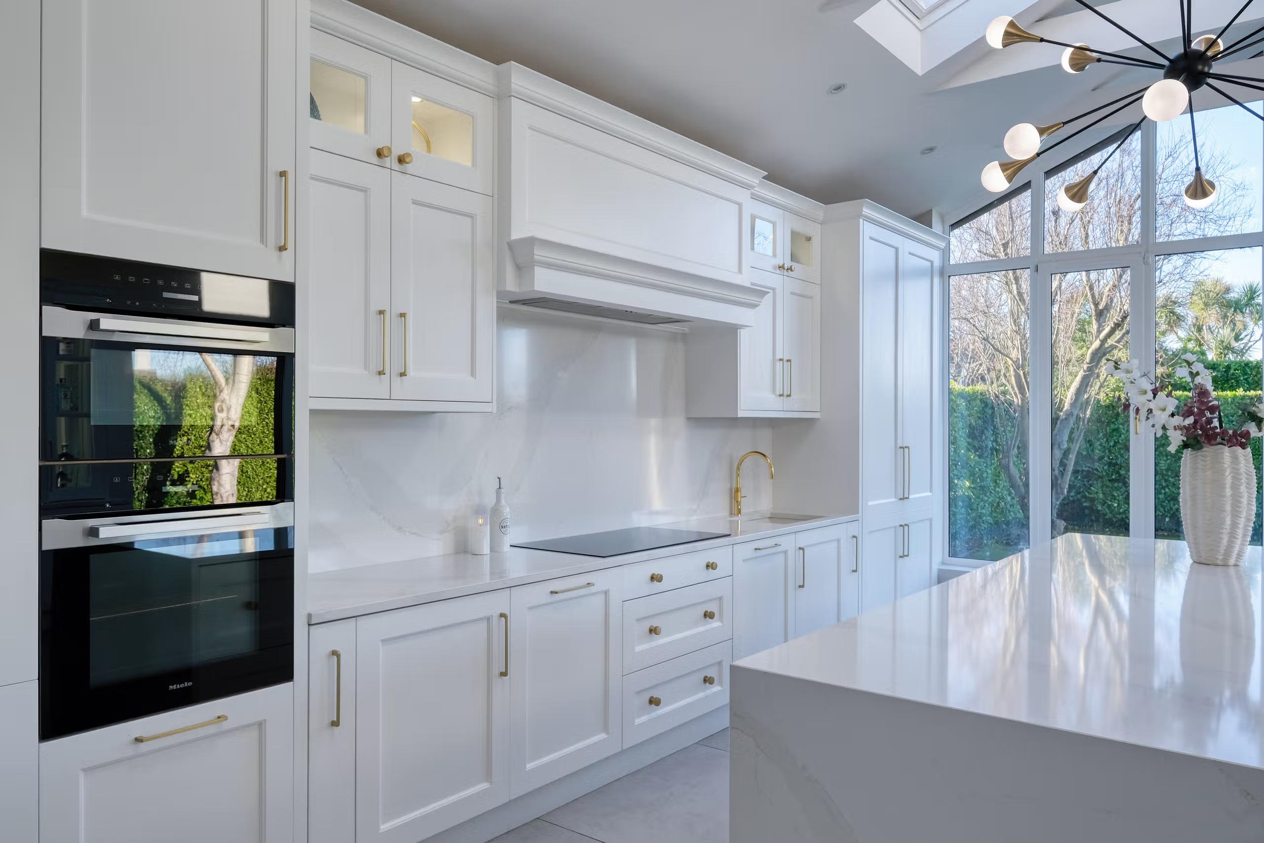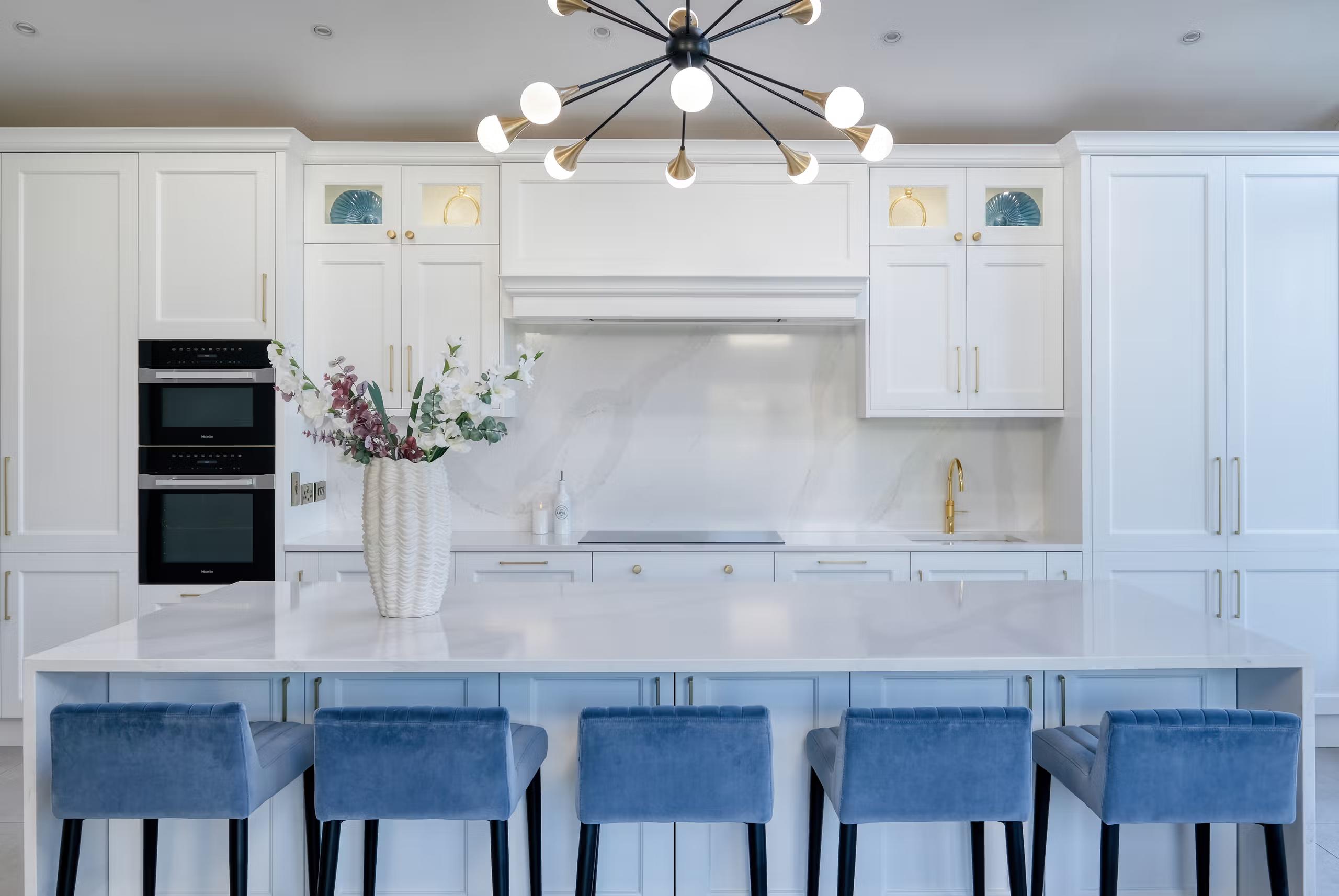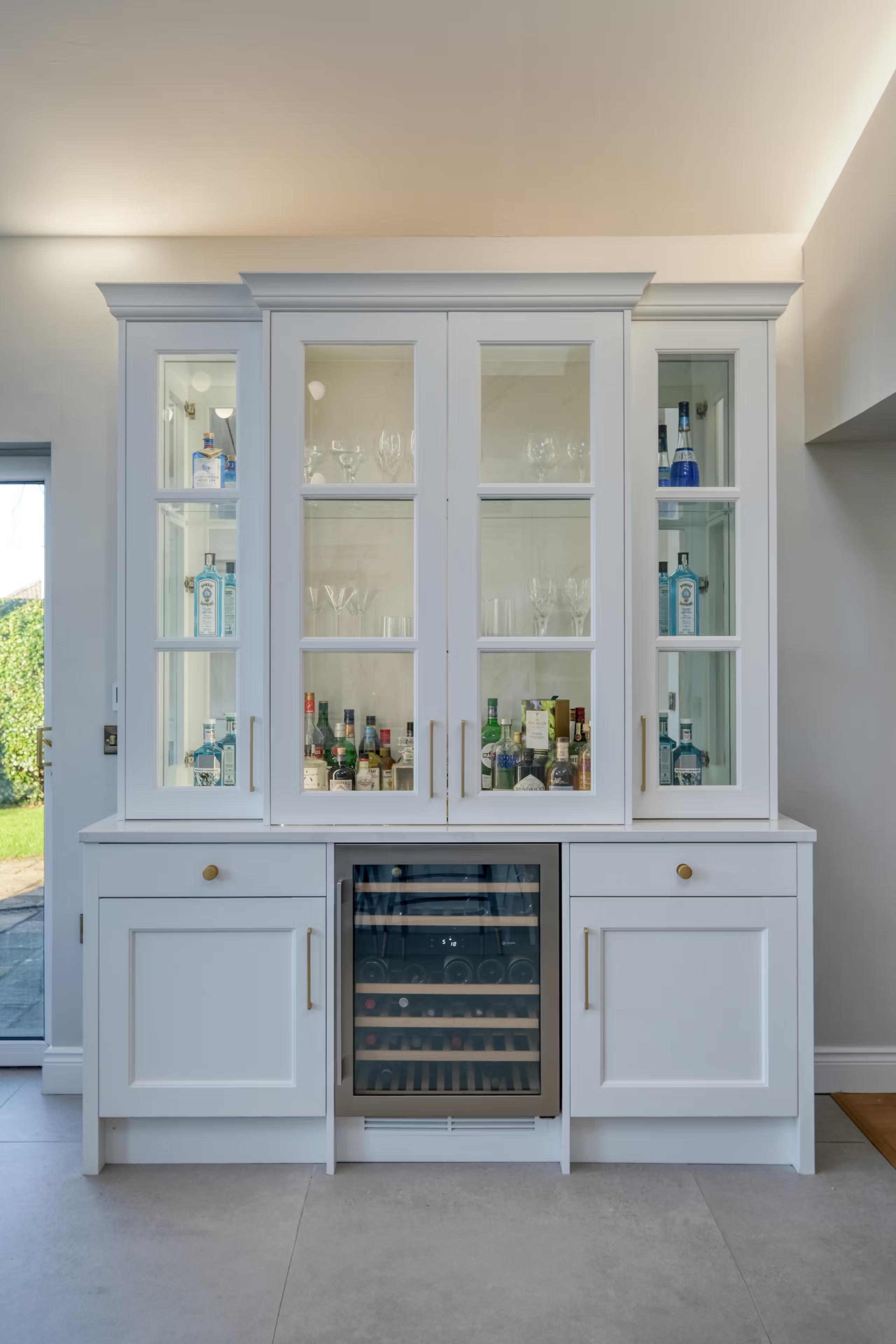 This classical style kitchen was custom-made by workshop to the exact client specification. With stone gables on the island and bespoke bar area. Hand painted in Farrow and ball all white , with a stunning amount of daylight in this space, there is an overwhelming feeling of calm when sitting in this fabulous kitchen.